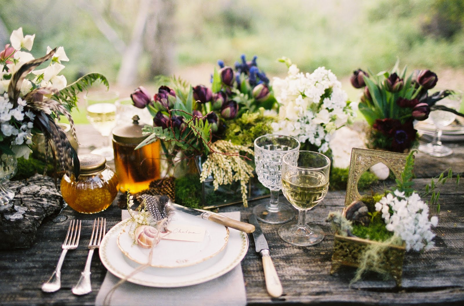 and bone flatware, vintage flint glasses, antique horn vases.)
